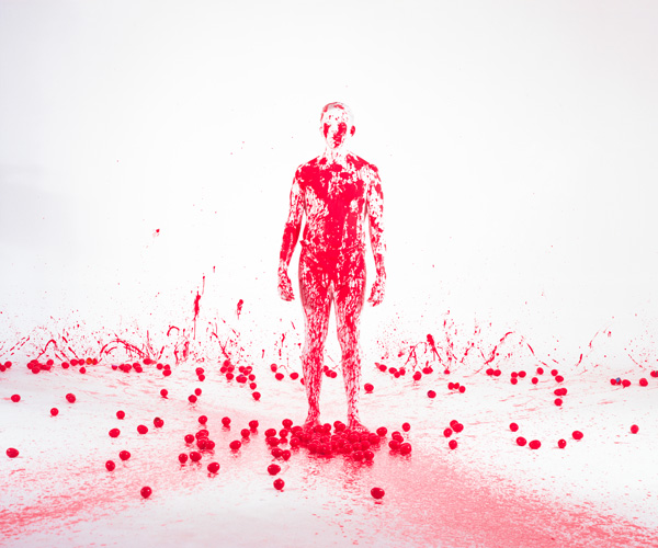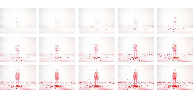 In this piece, the artist is painted white on an all white background; barely visible to the camera. Suddently, red paint-covered balls are thrown, striking the white figure, creating red splatters on the once prestine white form. As the piece progresses, the figure is barraged by the paint-covered balls until at last the figure is completely covered in red. After all of the mayhem, silence returns, but the figure is now in sight, no longer hidden by the concealing white mask.