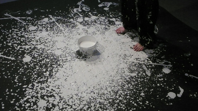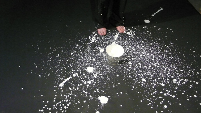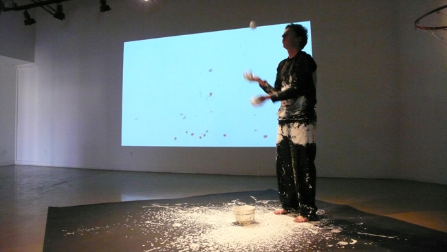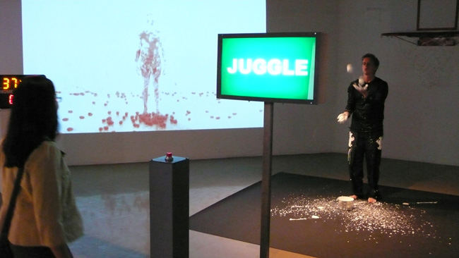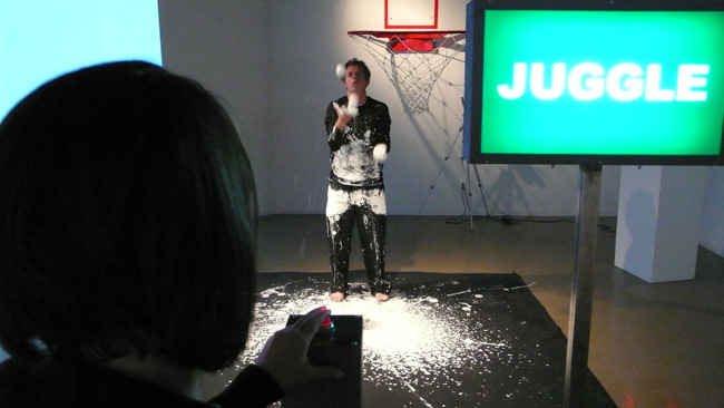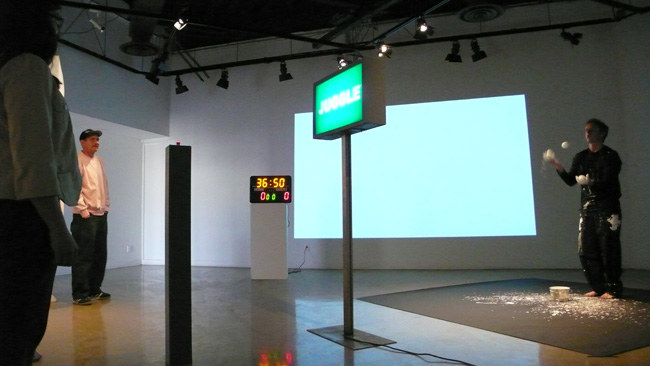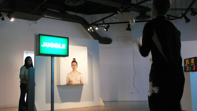 Juggle was a two-week, one-hour per day interractive performance. Participants were able to push a glowing red button on a pedestal. After pushing the button, a sign incribed with "Juggle" would light up, prompting the artist to juggle paint-covered balls while standing on black paper. The resulting white paint which splatters the paper and artist's clothes represents the kinetic motion of the juggling act, the dropped balls, and the interraction of people entering the gallery and making the artist juggle. This work is unique to the people, time, and location. It explores how we can manipulate other people to perform, entertain, and even fail. The paint contains all of these elements.